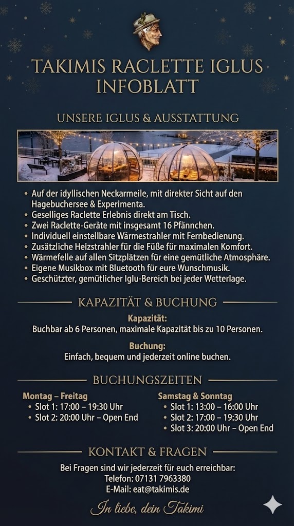 Auf der idyllischen Neckarmeile stehen euch zwei gemütliche und beheizte Raclette-Iglus zur Verfügung – mit direkter Sicht auf den Hagebuchersee sowie die Experimenta. In den Iglus genießt ihr gemeinsam ein geselliges Raclette Erlebnis direkt am Tisch, während die besondere Lage für ein stimmungsvolles Ambiente und unvergessliche Genussmomente sorgt.